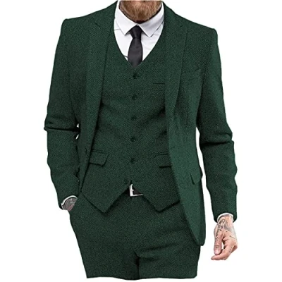 Mens Vintage Suit 3 Pieces Tweed Herringbone Prom Tuxedos Blazer Peak Lapel Groomsmen(Hunt Green,38)
