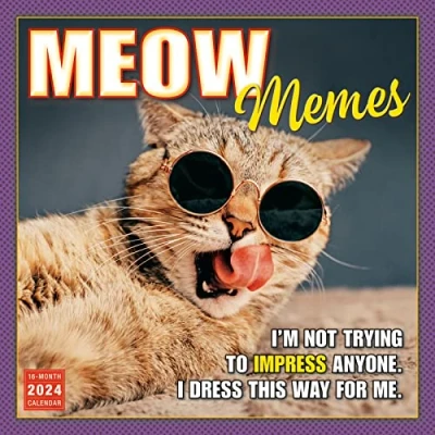 The Meow Memes wall calendar pairs cats with snarky commentary confirming CATTITUDE is a very real thing Large, easy to use, 12" x 12" full-page grids with small at-a-glance month grids Bonus September - December 2023 calendar spread Includes all major U.S., Canadian, United Kingdom, Australian, and New Zealand holidays & moon phases Four-color printing throughout with environmentally friendly soy-based inks and a sturdy UV protected cover