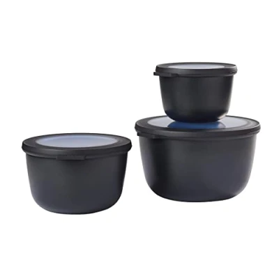 MULTIFUNCTIONAL: The kitchen bowl Cirqula can be used as storage box & serving dish. The bowl is suitable for the microwave, freezer & dishwasher. Perfect as meal prep starter set! COMPONENTS: The leak-proof storage boxes have a fully removable lid with viewing window. The lid seals the container properly which makes the container airtight PRODUCT INFORMATION: The trays can be used as storage trays for freezing food and, without lids, for reheating in the microwave. The containers are 100% leak-proof and airtight DESIGN: The boxes are stackable on top of each other or inside each other. In short, they are space-saving. The design also makes the bowl suitable for tableware such as a plastic salad bowl CAPACITY & DIMENSIONS: The kitchen set consists of 3 bowls, with the capacity of 350 ml, 750 ml & 1250 ml. The different sizes allow you to store a variety of foods in the storage containers SUSTAINABLE & BPA-FREE: The round storage container set Cirqula is, like all Mepal products, long-lasting and BPA-free. You can reuse the containers in no time after a rinse in the dishwasher