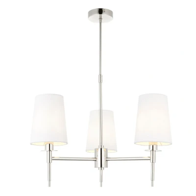 Fill a space with warm light and bring chic style into any decorating aesthetic with the Florence 3-Light Multi Arm Bright Nickel Plate and Vintage White Fabric Shade Pendant Ceiling Lamp. Its slender form and sophisticated attitude make it a great choice for a contemporary or minimalist interior.