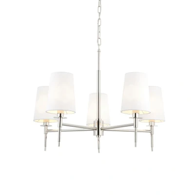Fill a space with warm light and bring chic style into any decorating aesthetic with the Florence 5-Light Multi Arm Nickel Plate and Vintage White Fabric Shade Pendant Ceiling Lamp. Its slender form and sophisticated attitude make it a great choice for a contemporary or minimalist interior.