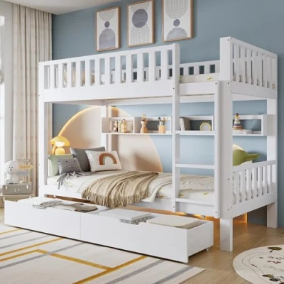 Practical Bunk Bed: The bunk bed can be split into 2 single 3ft beds, saving space for families with two children. Sturdy Construction: The bed is made of pine wood and sturdy slats for strength and durability. The three-level right angle staircase and four sides fences are convenient and safe. Convenient Storage Space: Practical drawers with pulleys can be used to store daily clothes, toys and other items. A row of shelves at the bottom of the upper bed can be used to store trinkets, books, and others. Clear Assembly Instructions: The product includes a clear instruction manual, hardware and other tools. Maintenance: Daily cleaning only needs to be wiped gently with a rag.