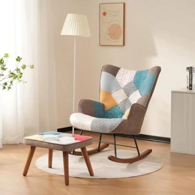 【Stylish and Functional Design】This quilted rocking chair beautifully combines eye-catching design with practicality. Its patchwork surface adds unique charm, while the solid wood and iron construction ensures durability and long-term stability, making it a standout addition to any home. 【Vibrant Colors and Warm Atmosphere】The lively patchwork patterns create a cheerful and inviting ambiance, while the elegant walnut wood frame adds a touch of sophistication. The harmonious blend of bright colors and natural wood instantly uplifts any room's mood. 【Long-Lasting Comfort】Filled with reliable padding, this nursing chair provides superior comfort and support for extended relaxation. The smooth surface with no sharp edges and the sturdy iron and wooden feet give you a secure and worry-free seating experience. 【Versatile Relaxation】Perfect for both sunny afternoons and cozy evenings, this living room chair is designed to bring moments of joy and comfort. Whether placed in the living room, bedroom, or reading nook, it enhances your space with style and ease. 【Compact and Seductive】Small yet sophisticated, this rocking chair is perfect for those looking for a space-saving solution without compromising on design. Its seductive versatility makes it an elegant feature that effortlessly blends into any interior.
