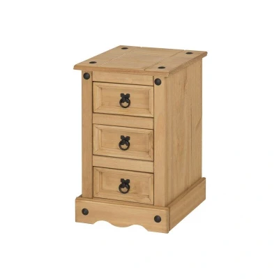 General description The Corona Narrow 3 Drawer Bedside is expertly crafted from solid pine and hand waxed to enhance its natural grain. This bedside table offers outstanding value for money with three spacious drawers, making it a practical addition to any bedroom. The black metal fittings provide a distinctive Mexican styling, contributing to its warm rustic country charm. Technical specifications Height: 58 cm Width: 35 cm Depth: 33 cm Material: Solid pine with hardboard backs and drawer bases Installation The bedside table is delivered flat packed for easy home assembly, complete with step-by-step instructions.