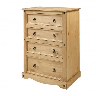 General description The Corona 4 Drawer Chest is expertly crafted from solid pine and hand waxed to enhance its natural grain. This chest offers outstanding value with four spacious drawers, making it a practical addition to any room. The black metal fittings contribute to its distinctive Mexican styling, providing a warm rustic country charm. Technical specifications Height: 130 cm Width: 92 cm Depth: 48 cm Material: Solid pine with hardboard backs and drawer bases Installation The chest is delivered flat packed for easy home assembly, complete with step-by-step instructions.