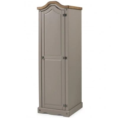General description The Corona Grey Wax 1 Door Wardrobe features a subtle grey wash body that highlights the natural grains and textures of the solid pine wood, offering a modern twist on a classic design while retaining the beloved characteristics of the Corona range. Expertly crafted and hand waxed, this wardrobe not only protects and preserves the wood but also enhances its grain. With its decorative metal fittings, the wardrobe showcases distinctive Mexican styling and adds a warm rustic country charm to any home. Technical specifications Height: 176 cm Width: 55 cm Depth: 45 cm Material: Solid pine with a hand-waxed finish Back: Hardboard Installation The wardrobe is delivered flat packed for easy home assembly, complete with step-by-step instructions.