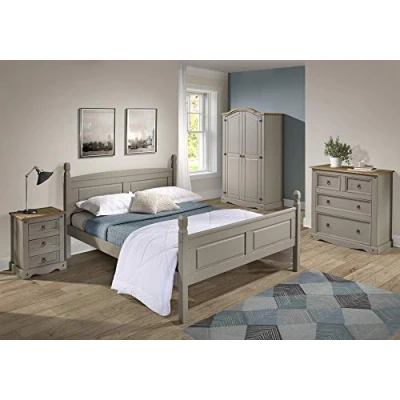 General description The Corona Grey Wax 4'6" High End Bed Frame combines a subtle grey wash finish with the natural grains and textures of solid pine wood, offering a modern twist on a classic design. This bed frame retains the beloved characteristics of the Corona range, featuring decorative metal fittings that add a distinctive Mexican styling and warm rustic charm. Technical specifications Height: 116 cm Width: 143 cm Depth: 201 cm Installation The bed frame is delivered flat packed for easy home assembly, complete with step-by-step instructions.