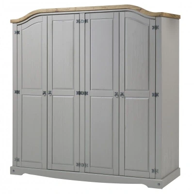 General description The Corona Grey Wax 4 Door Arch Top Wardrobe features a subtle grey wash body that highlights the natural grains and textures of the solid pine wood. This wardrobe combines a modern twist with classic design elements, retaining the beloved characteristics of the Corona range. It is adorned with decorative metal fittings that enhance its distinctive Mexican styling, adding a warm rustic country charm to any bedroom. Technical specifications Height: 190 cm Width: 191 cm Depth: 51 cm Installation The wardrobe is delivered flat packed for easy home assembly, complete with step-by-step instructions.
