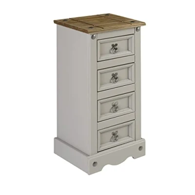 General description The Corona Grey Wax 4 Drawer Narrow Bedside features a subtle grey wash body that highlights the natural grains and textures of the wood, offering a modern twist on a classic design while retaining the beloved characteristics of the Corona range. Expertly crafted from solid pine and hand waxed, it protects and enhances the wood grain. With 4 drawers, it provides excellent value and is a charming addition to any home. Decorative metal fittings contribute to its distinctive Mexican styling, adding a warm rustic country charm. Technical specifications Height: 74 cm Width: 35 cm Depth: 33 cm Material: Solid pine with hardboard backs and drawer bases Installation The item is delivered flat packed for easy home assembly, complete with step-by-step instructions.