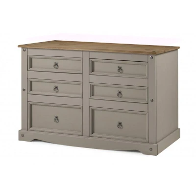 General description The Corona Grey Wax Low 3+3 Wide Chest features a subtle grey wash body that highlights the natural grains and textures of the solid pine wood. This piece offers a modern twist on a classic design while retaining the beloved characteristics of the Corona range. With six spacious drawers, it provides excellent value and adds a warm rustic charm to any home, enhanced by decorative metal fittings that reflect its distinctive Mexican styling. Technical specifications Height: 83 cm Width: 132 cm Depth: 43 cm Material: Solid pine with hand waxed finish Drawer construction: Hardboard backs and bases Installation The chest is delivered flat packed for easy home assembly, complete with step-by-step instructions.