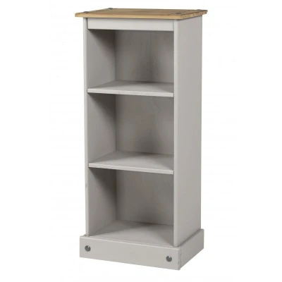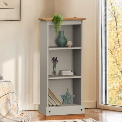 General description The Corona Grey Wax Low Narrow Bookcase features a subtle grey wash body that highlights the natural grains and textures of the solid pine wood. This bookcase combines a modern twist with classic design elements, retaining the beloved characteristics of the Corona range. It is expertly crafted and hand waxed to protect and enhance the wood's grain, making it a beautiful and functional addition to any home. Technical specifications Height: 104 cm Width: 46 cm Depth: 20 cm Installation The bookcase is delivered flat packed for easy home assembly, complete with step-by-step instructions. Other information Finished with decorative metal fittings, this bookcase showcases distinctive Mexican styling and adds a warm rustic country charm to your space.