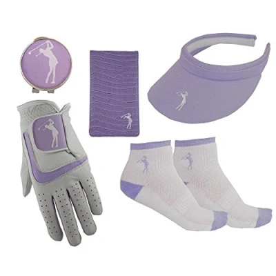 Ladies lilac cabretta leather golf glove.(choose size) Ladies golf socks with matching logo one size fits all. Ladies lilac golf clip on visor wit magnetic hat clip and ball marker. Faux leather crocodile lilac score card and course planner holder with pencil A saving of £6 on items bought individually.. sent post free !