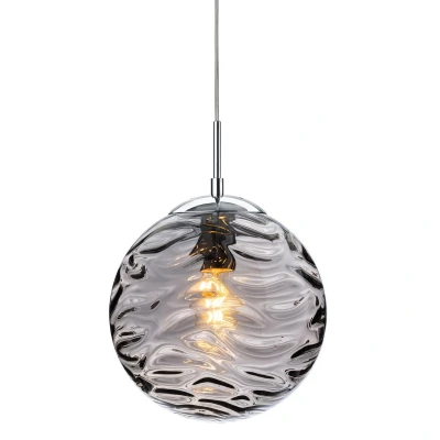 At the heart of the Mercury Pendant Light's appeal is its captivating design. Featuring a smoked glass shade adorned with a decorative wave effect, this lamp creates a visually striking and unique focal point in any room. The textures and ripples in the glass add depth and interest, while the shiny chrome metalwork and ceiling cup introduce a touch of contemporary elegance. This interplay of materials fosters an aesthetic that is simultaneously bold and refined.