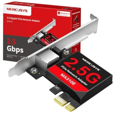 Super-Fast 2.5 Gbps Networking — With 2.5G Base-T technology, MA310E pcie card delivers high speeds of up to 2.5 Gbps, which is 2.5× faster than typical Gigabit adapters, guaranteeing smooth data transfers for both internet access and local data transmissions Multi-Speed Compatible pcie Card PC — Automatically negotiates between higher and lower speed connections to ensure smooth data transmission for all your bandwidth-intensive tasks Share Files in Seconds — MA310E card fully utilizes your 2.5 Gbps internet access and can seamlessly connect to NAS devices for high-speed local data transmission Wake-on-LAN — Remotely power on/off your PC via a dedicated network signal, making it the ultimate companion for remote work; pcie card Energy-Efficient Ethernet (EEE) — Equipped with EEE technology, MA310E can slash energy use, trim your carbon footprint, and guarantee flawless performance. Flexible Installation Network Card — Includes both standard and low-profile brackets for compatibility with various board designs Pcie Card System Compatibility — Supported operating systems include Windows 11/10/8.1/8/7, Windows Servers 2022/2019/2016/2012R2/2012/2018 R2, and Linux. No driver needed on Windows 11/10. Drivers for other systems are available on the official MERCUSYS website