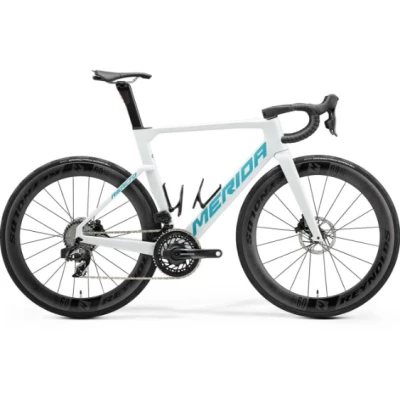 The Reacto 9000 stands as a testament to aerodynamic innovation and comfort optimization. Employing Computational Fluid Dynamics (CFD) calculations and rigorous wind tunnel tests, Merida achieved a remarkable 209 watts effort for 45 km/h, outperforming its predecessor. The integration of front disc cooler, rear disc caliper, and new bolt-through axles showcases meticulous attention to detail. Despite accommodating larger tyres, the Reacto delivers an unparalleled blend of comfort, aerodynamics, lightweight, and style. Key Features: Frame: CF5 IV with top-tier fibres, aggressive pro-tour geometry, disc cooler, BB86 bottom bracket standard, and 142 x 12mm axle standard. Max tyre clearance of 700 x 30c. Fork: Reacto CF5 IV disc with full carbon construction, tapered steerer, and disc cooler technology. Max tyre size: 700 x 30c. Drivetrain: Sram Force AXS 24-speed drivetrain with a 50-37 tooth chainset and power meter for precision performance. Brakes: Sram Force AXS hydraulic disc brakes with 160mm rotors, mounted on the chainstay for efficient force dissipation. Wheels: Part of the Reynolds BL60 Pro wheelset with a 21mm inner rim width, 60mm rim depth, carbon construction, and tubeless-ready capability. Tyres: Continental Grand Prix 5000s TR, 700 x 28c, featuring a Kevlar bead and tubeless-ready design. Seat Post: Merida Team CW aero-shaped carbon seat post with a 15mm layback and integrated rear light. Saddle: Prologo Scratch M5 with V-mount adapter, including a Merida minitool. Additional Feature: Team one-piece integrated carbon stem, Sram Force AXS components, and availability with 0% APR finance.Merida Reacto ReviewRide the Merida Reacto 9000 for an unparalleled cycling experience, where aerodynamics meet comfort in a race-proven package endorsed by cycling experts and champions alike.