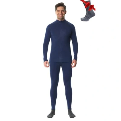 Merino.tech Merino Wool Base Layer Men Set Thermal Underwear Mens Top and Bottom Lightweight, Midweight, Heavyweight (Medium, 250 Windsor Blue Zip up Set)
