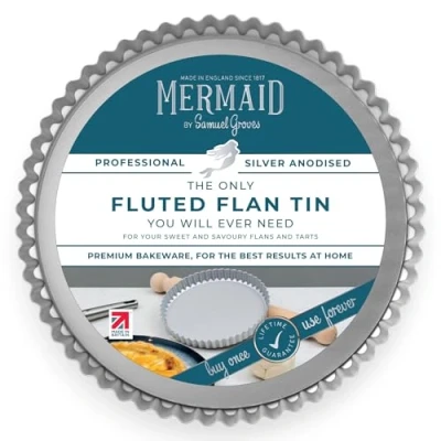 Made in England premium silver anodised fluted flat tin loose base by Samuel Groves. Handcrafted in Birmingham since 1817 for even heat, durability, and professional non-stick baking performance. Heavy duty aluminium warp-resistant fluted flat tin - precision-engineered from silver anodised aluminium, this tin ensures even heat distribution and zero warping under high temperatures. Naturally non- stick chemical free surface, the anodised bakeware surface builds a natural non-stick layer. No coatings or toxins, just easy release, fast cleaning and perfect results. Silver anodised cookware ensures even heat distribution, eliminating hot spots for consistent, perfectly cooked results—ideal for baking, roasting, and everyday professional cooking. Each silver anodised flan tin comes in recyclable, eco-friendly packaging. Hand wash to preserve its finish—durable, sustainable bakeware backed by a trusted lifetime guarantee., Manufacturer: mermaid