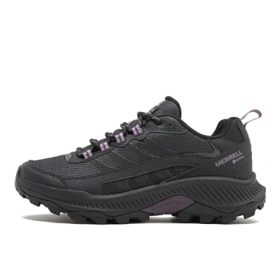 Built with a GORE-TEX membrane, this hiking shoe offers full waterproof protection while maintaining a lightweight, athletic feel for those faster-paced pursuits. Made with sustainability in mind, it's packed with eco-friendly materials, from 100% recycled laces, webbing, and mesh lining to a 50% recycled removable EVA footbed. Beneath it all, a Merrell sticky rubber outsole delivers powerful traction so you can navigate challenging terrain with ease. Experience premium protection, enhanced speed, and unbeatable grip with the Speed Strike 2 GTX—the ultimate hiking companion for the adventurous spirit. • GORE-TEX waterproof membrane, exceptional breathability and waterproof performance • Waterproof synthetic leather and ripstop upper • 100% recycled laces and webbing • Padded collar • Bellows tongue keeps out debris • Protective and abrasion-resistant synthetic heel and toe cap • Heel loop for ease of entry as well as carabiner compatibility • 100% recycled webbing • 100% recycled breathable mesh lining • 50% recycled mesh footbed cover • Cleansport NXT treated for natural odour control • 50% recycled EVA foam footbed • Lightweight EVA foam midsole for stability and comfort • Rubber outsole • Colour: Black