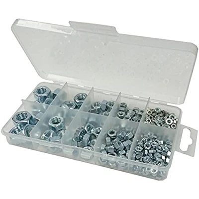 An assortment of BZP hex nuts in a 10 compartment carry case. Sturdy clear plastic case with snap close & hanging tab Case dimensions: 19.5cm x 10cm x 3cm For sizes and finish - see description Manufacturer: Merriway, Manufacturer: Merriway