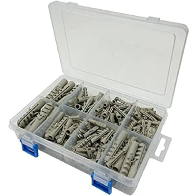 An assortment of grey heavy duty rimless nylon wall plugs in a 8 compartment carry case. Sturdy clear plastic case with snap close & hanging tab Case dimensions: 22cm x 14.5cm x 5cm For sizes and finish - see description Manufacturer: Merriway, Manufacturer: Merriway