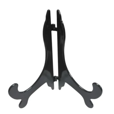 Sturdy black plastic plate stands suitable for displaying plates, photos, plaques, or collectibles. Adjustable size range, ideal for items between 100mm and 150mm. Simple foldable design for easy storage when not in use. Pack of 2 stands.