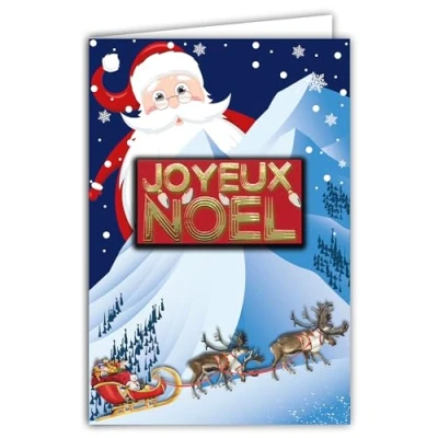 Merry Christmas Card Embossed Collage Glossy Text with White Envelope 12 x 17.5 cm Santa in the Mountain Sleigh Reindeer Hood Gifts Tree Snow Winter Best Wishes for Child Family