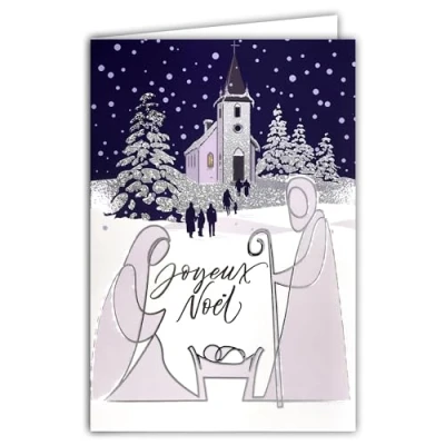 Merry Christmas Card Shiny Silver Glitter with White Envelope Size 12 x 17.5 cm Illustration Nativity Scene Jesus Marie Joseph Church Mass Tree Landscape Design Made in France