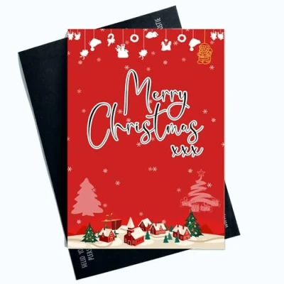 Merry Christmas Greeting Card Festive Red Background with Charming Houses and Scene Perfect Holiday Wishes for a Joyful Celebration SP144
