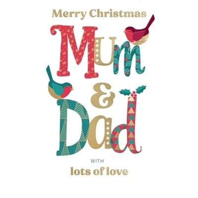 You Are Viewing: A Christmas Greeting Card Occasion: Perfect for Christmas celebrations. Details: This eco-friendly contemporary card has been thoughtfully designed by Second Nature as part of their Festive Cheer range and features patterned foiled mum & dad lettering with a pair of embossed gold tipped robin red breasts with the caption 'Merry Christmas Mum & Dad with lots of love'. Good to know: This card is crafted from high-quality card, comes with a gold envelope, is printed using eco-friendly inks, and is protected with a cello wrap cover. Size: 16cm x 23cm or 6" x 9"