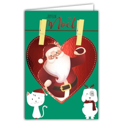 Merry Christmas Red Glossy Santa Card with White Envelope Size 12 x 17.5 cm Heart Decoration Cat Dog Animals Hat Top Wishes End of Year for Sage Child Made in France