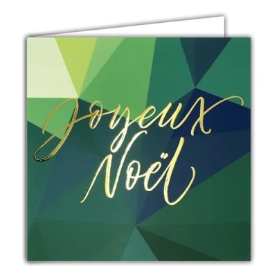 Merry Christmas Square Card in Shiny Gold with White Envelope 15 x cm Blue Green Fir Geometric Triangular Facets Abstract 25 December Holidays End of Year Made France