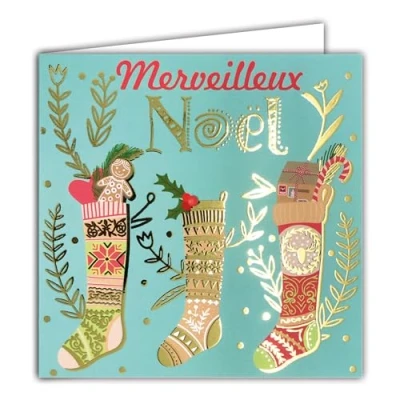 Merry Christmas Square Card in Shiny Gold with White Envelope 15 x cm Gifts Shoes Socks Boots Santa Claus 25th December Holidays End of Year Holly Biscuit Heart Made France
