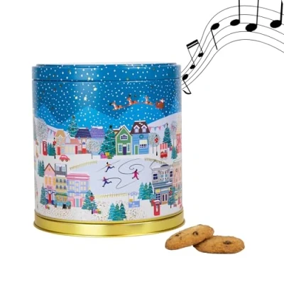Beautifully Embossed Biscuits Tin: A delicately embossed winter village carousel Christmas biscuit tin gift in the traditional colours of blue and white - a beautiful tin of biscuits to display in your kitchen as Christmas decor in the home Musical Christmas Carousel Biscuit Gift: This beautiful Christmas tin biscuits gift doubles up as a rotating Christmas music carousel and plays the melody of "‘Have Yourself a Merry Little Christmas" Filled with Luxury Biscuits: Our Christmas biscuits tins are filled with delicious mini chocolate chip cookies! Once empty, reuse the musical biscuit tin to store mince pies, Christmas shortbread biscuits and cookies, or even sweets The Perfect Christmas Gift: These Christmas tins of biscuits make beautiful Christmas biscuits gifts during the seasonal period, and can even be used as a table centerpiece on Christmas day, or for lovely vintage Christmas decorations in the home Suitable for Vegetarians: These novelty musical Christmas biscuit gifts are delicious and suitable for vegetarians. Please refer to the nutritional info & ingredients on the outer sleeve of our biscuits gift set tin for the full list of allergens