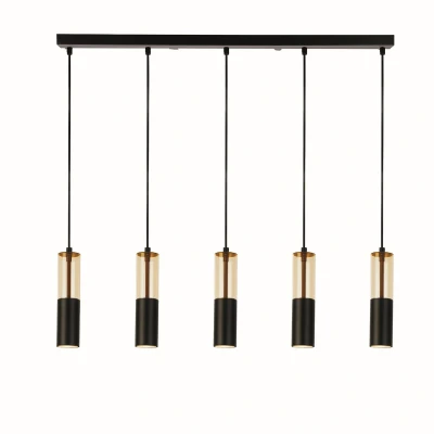 Transform your living space with the Merrygold 5 Light Bar Ceiling Pendant, a stunning lighting solution that combines elegant design with practical functionality. This pendant light is ideal for a variety of settings, making it a perfect addition above dining areas or kitchen islands. The straightforward yet sophisticated design features five elegant black and amber cylindrical shades, suspended from a coordinating ceiling bar, which creates a striking visual statement in any room.