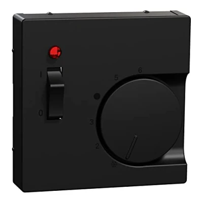 For System M. Thermostat Cover MEG5760-0403 for Bi-Metal Thermostat Inserts in Matt Black Mounting is done with a screw. The central plate is made from recycled material consisting of industrial waste The colour is black based on RAL9005 with a matt finish through the paintwork. The product is designed for IP20 use for flush or surface mounting This device is intended for the thermostat insert 536302. This device contains an on/off switch The material used reduces waste and is part of the environmental initiative of Schneider Electric