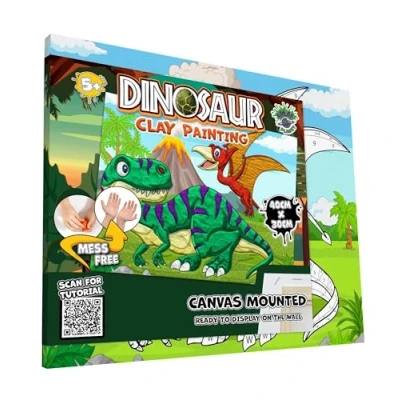 Mess Free Dinasour Clay Painting Kit, Air Dry Modelling Sensory 3D Canvas Fun Arts and Crafts Kit for Kids, Pre Framed 40x30cm with Tools & Idea Guide, Fun, Hands On Gift Creativity