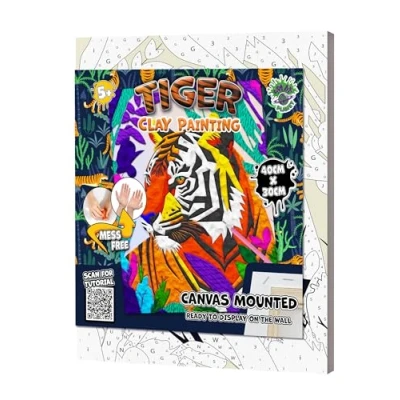 Mess Free Tiger Clay Painting Kit, Air Dry Modelling Sensory 3D Canvas Fun Arts and Crafts Kit for Kids, Pre Framed 40x30cm with Tools & Idea Guide Fun, Hands On Gift Creativity