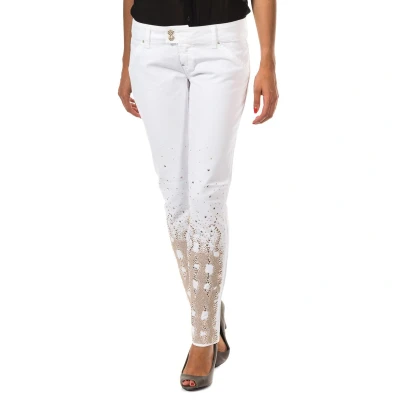 Long denim trousers. White color. Design with gold studs on the front. Zipper closure and buttons, on the front. Waist with belt loops. Two open pockets, on the front. Two open pockets at the back. Metallic application with the name of the engraved mark, on one of the back pockets. Basses with narrow cut. Stitched seams. Composition: 97% Cotton. - 3% Elastane. Care: Washing instructions: - Wash maximum at 40ºC. - Iron at medium temperature, max. 110ºC. - Allows you to use a dryer. - Do not use bleach. - Does not support dry cleaning.