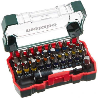 General description The Metabo 32 Piece Bit Set is crafted from high-quality chrome-vanadium steel (S2 quality) and features color ring coding for quick and easy identification. It comes in a robust storage box with a unique Metabo design and includes an extendable toolbar hanger for added convenience. Technical specifications Material: Chrome-vanadium steel (S2 quality) Pack Quantity: 32 bits Type: Mixed Set Dimensions of bits: 25mm Compatibility and accessories 1 x 1/4in Head Adapter 1 x Quick Release Bit Holder Usage This bit set is ideal for various applications, including driving screws and fastening tasks across different materials. The color coding allows for quick identification of the right bit for the job. Other information