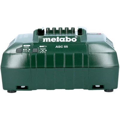 General description The Metabo ASC 55 Air Cooled Slide Charger is designed for charging all Li-Power Compact, Li-Power Plus, Li-Power Extreme, and LiHD slide-on battery packs ranging from 12V to 36V. It features patented AIR COOLED technology that cools the battery pack during the charging process, ensuring optimal temperature and significantly reducing charging times. The charger is microcontroller-monitored for accurate battery diagnostics and switches to a compensation charge mode to conserve battery capacity. Technical specifications Battery voltage: 12 - 36 V Mains voltage: 220 - 240 V Mains frequency: 50 - 60 Hz Max. charging current: 3 / 4 A Output rating: 55 W Charging time for 18 V/4.0 Ah: 80 min Charging time for 18 V/8.0 Ah: 160 min Weight: 582 g Compatibility and accessories Compatible with all Li-Power and LiHD slide-on battery packs (12 V - 36 V) Supports battery packs of the CAS brands Installation Simply plug into a mains outlet (220 - 240 V) for operation Usage Ideal