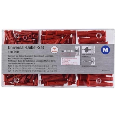 Metafranc 952250 Universal Assortment 180 Pieces Diameter 5/6 / 8 mm Made in Germany for Fixings Solid and Hollow Building Materials/All Purpose Expansion Dowels/Triwings, red
