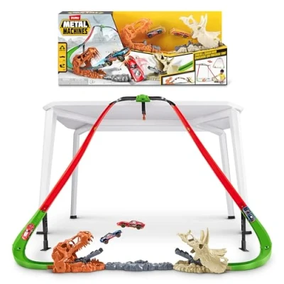 DOUBLE DINO DESTRUCTION: Take on 2 massive Dino heads—crash through their jaws or get caught in the chaos 2 METAL MACHINES CARS: Jump into action with 2 high-speed vehicles—ready to race, crash, and smash straight out of the box. 3.5 METERS / 11.5 FT OF TRACK: Build epic crash courses with over 11 feet of flexible track for high-speed stunts and custom setups. INCREDIBLE VALUE: Packed with 2 dinos, 2 cars, and over 3.5m of track—this playset delivers maximum action at an unbeatable price. METAL MACHINES PROMISE: Metal Machines brings speed, challenges and action right to you with new design cars and fun track sets with incredible value., Manufacturer: ZURU