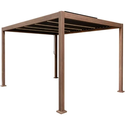 Turn your outdoor space into a sanctuary of relaxation and style with our meticulously crafted wood effect aluminium pergola with LED lights. Designed to enhance any garden or outdoor area, this pergola effortlessly combines functionality with aesthetic appeal. Crafted from high-grade aluminium with a sleek powder-coated finish, our pergola ensures exceptional strength and resilience against the elements. Whether placed on your patio, garden, or backyard, its modern design adds a touch of sophistication, becoming a captivating focal point for entertaining guests or unwinding in the open air. With its adjustable louvers, our wooden effect pergola gives you full control over sunlight and shade, allowing you to customise your outdoor environment to suit your needs and preferences. Whether you desire a sun-drenched retreat or a shaded sanctuary, simply adjust the louvers with the easy-to-use manual system. As daylight fades, enjoy the captivating glow of integrated LED lights, beautifully