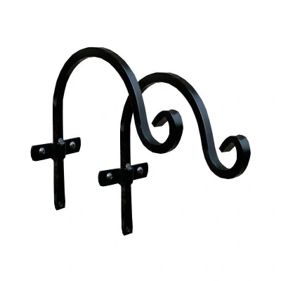 General description The elegant curve of these steel hooks means they both look smart and are practical in the home and garden. These hooks are ideal for hanging baskets, lanterns, bird feeders, and are also handy for storing tools and other garden sundries. Technical specifications Material: Black powder coated steel Dimensions: 20cm L x 8cm W (at cross bar) x 20cm H Pack of: 2 hooks Other information Can be used indoors or outside Durable weatherproof coating