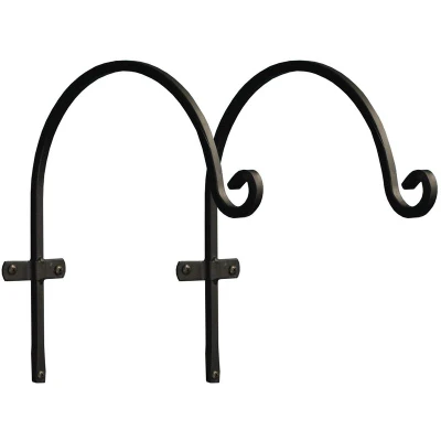 General description The elegant curve of these steel hooks means they both look smart and are practical in the home and garden. These hooks are ideal for hanging baskets, lanterns, bird feeders, and are also handy for storing tools and other garden sundries. Technical specifications Material: Black powder coated steel Dimensions: 30cm L x 8cm W (at cross bar) x 30cm H Pack includes: 2 hooks with fixings Usage Can be used indoors or outdoors Ideal for hanging baskets, planters, lanterns, and bird feeders