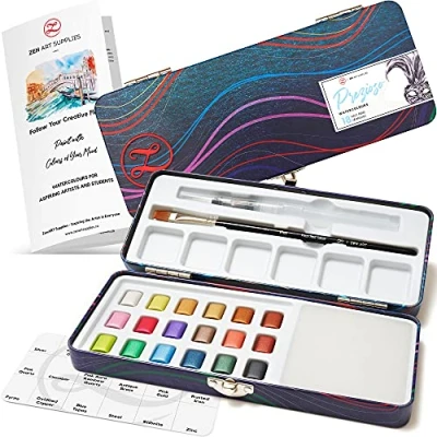 Metallic Watercolour Paints for Beginners 18 Half Pan Vibrant Water Colours Travel Set with Paintbrush, Brush, Mixing Area PREZIOSO Portable Paint by ZenART