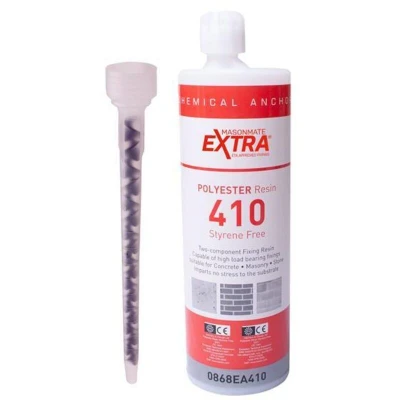 General description The MasonMate Chemical Anchor Resin is a two-component injection system designed for anchoring threaded rods in various materials. It is suitable for indoor and enclosed spaces due to its styrene-free formulation. The resin provides high bond strength and is versatile for use in masonry, concrete, and hollow or aerated concrete. Technical specifications Volume: 410ml Type: Polyester SF resin Working time: Fast, allowing early loading Bond strength: High Approval: ETA approved for concrete and masonry/hollow wall installations Suitable for medium loads in non-critical applications Compatibility and accessories Compatible with threaded rods Designed for use in concrete, masonry, and hollow or aerated concrete Installation Inject the resin into the drilled hole according to manufacturer instructions Insert the threaded rod or anchor into the resin-filled hole Allow sufficient curing time before applying load Usage Suitable for anchoring in both dry and damp/wet