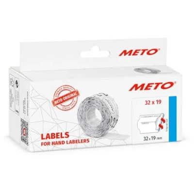 Original Meto hand labelling labels are suitable for pricing, date marking and labelling of item, batch, machine, employee numbers, etc. Labels made in Germany with approval for direct food contact Form "A consommer jusqu'au / fabriqué le", label size 32 x 19 mm for two-line devices, label shape: wavy edge; adhesive properties: permanent adhesive; colour: white 5 rolls of labels each with 1,000 labels per roll, total 5,000 labels Thanks to the universal transport cut, suitable for all standard 2-line hand labellers with the label size 32 x 19 mm (Meto, Contact, Blitz, Tovel, Open, Sato, Etimark, Samark, Herlitz, Prix, Avery Zweckform)