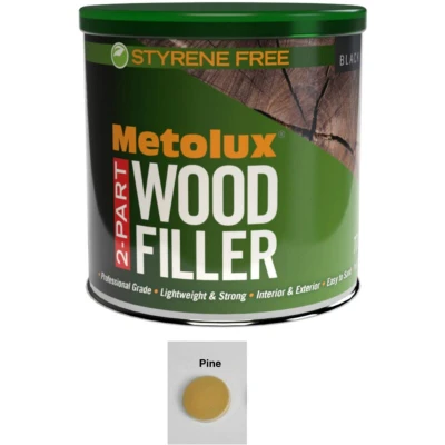 Metolux Two Part Wood Filler 250ml - All Colours Metolux 2 Part Styrene Free Wood Filler is a pre-coloured two-part high strength polyester wood filler supplied in retail and trade pack sizes. 7 colour shades available Supplied with a separate hardener, this wood filler provides a strong high quality repair to wood imperfections. Supplied in a large range of pre-coloured blends to match your wood type • Large trade pack sizes in a range of suitable colour matches. • Professional Grade • Durable Repair • Paintable & Stainable • Premium quality product for professionals. • Non slump for corner work. • Accepts all fi nishes including all known paint systems and varnishes. • Easy to sand down to perfection • Weatherproof for interior or exterior use. • Attractive hard wearing printed tin packaging with dish lid for spreader.