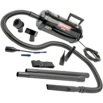 Powerful twin-fan vacuum for automobile and home use All-steel construction; 120-volt; 12-foot grounded cord 13 interchangeable attachments clean every crevice in car Also blow-dries carpet, inflates mattresses; reusable cloth dust bag Measures 17 by 7 inches; 6-foot flexible hose, 2 20-inch extensions, Weight: 12.5 pounds, Manufacturer: Metro Vacuum